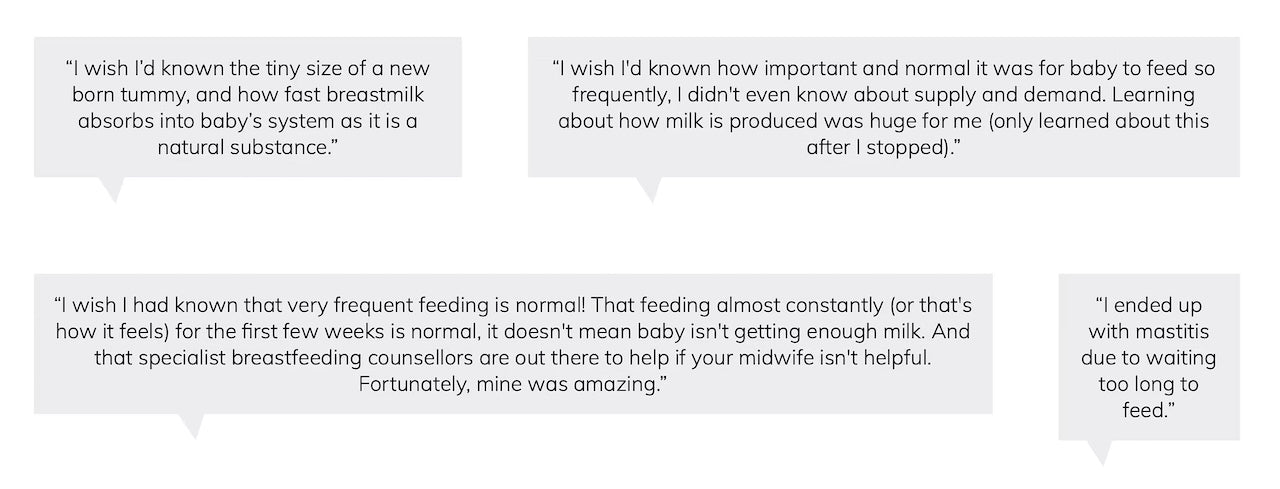 "I wish I had known that very frequent feeding is normal! That feeding almost constantly (or that's how it feels) is normal, it doesn't mean baby isn't getting enough milk."